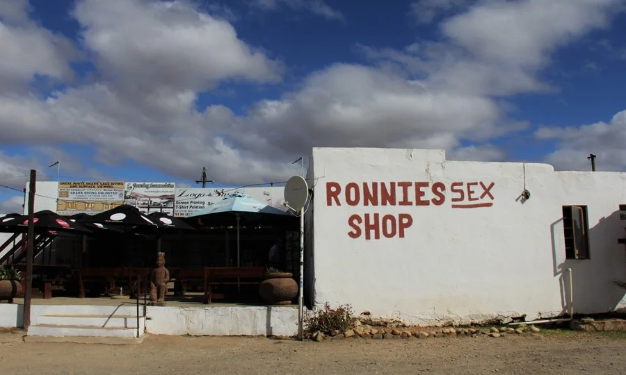 Head west from the small town of Barrydale, on Route 62, and just a few kilometres later you see it. The small white concrete building with red letters emblazoned on both sides “RONNIES SEX SHOP”. It may be small but it has become almost a world-famous landmark.